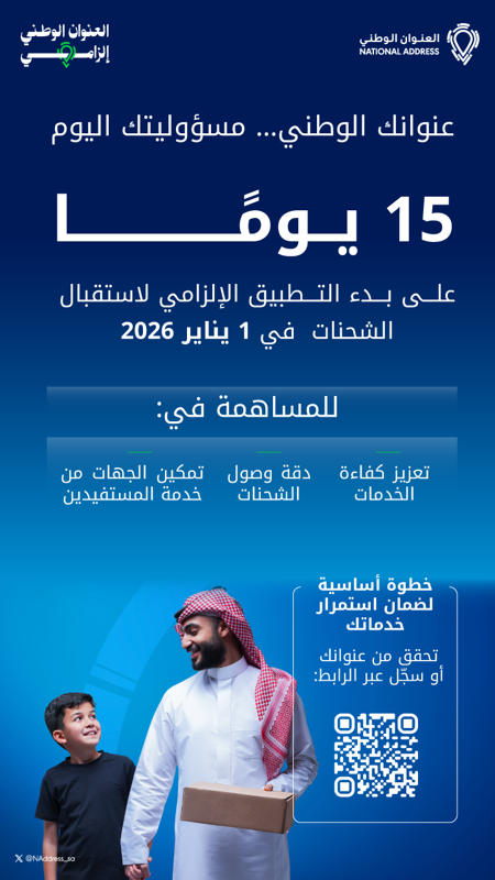 دعت الهيئة العامة للنقل الأفراد والمنشآت إلى استخدام عناوينهم الوطنية، قبل تطبيق القرار الذي يُلزم جميع شركات نقل الطرود بعدم استلام أو نقل أي شحنة بريدية لا تتضمن العنوان الوطني اعتبارًا من مطلع شهر يناير القادم، والمتبقي منه 15 يومًا على تنفيذ القرار.
